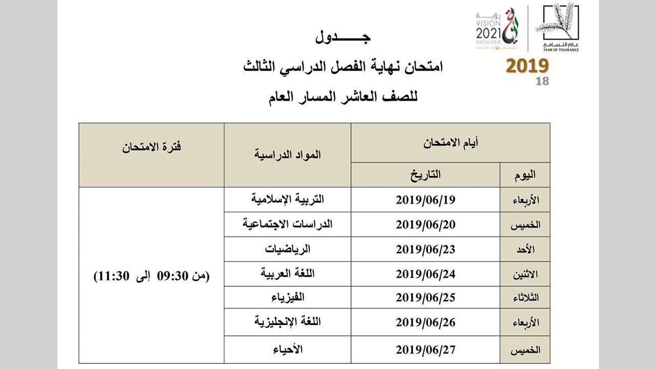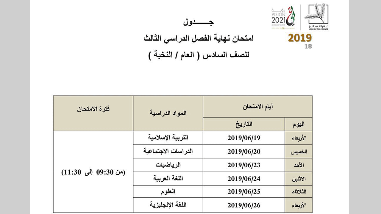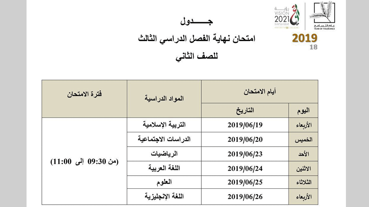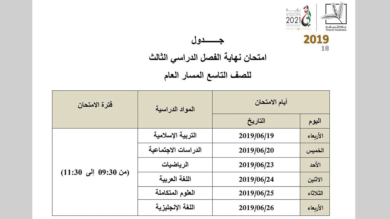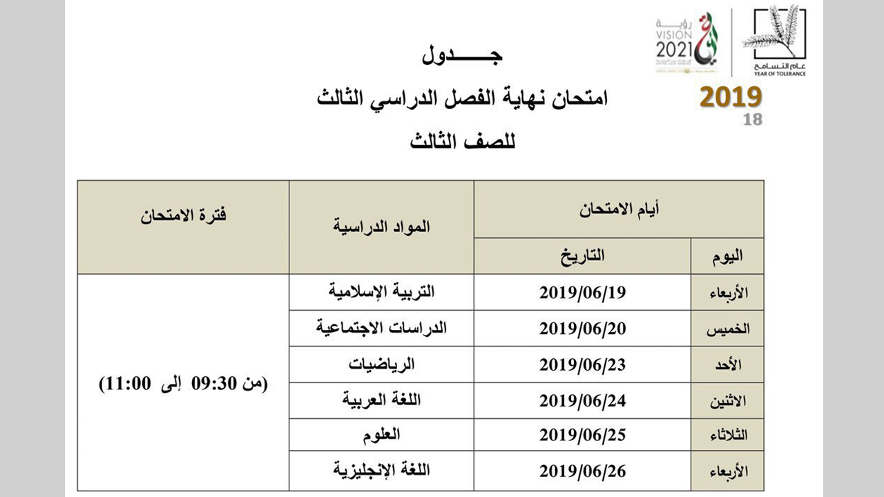 أعلنت وزارة التربية والتعليم اليوم جداول امتحانات طلبة المدارس الحكومية والمدارس الخاصة التي تدرس المنهاج الوزاري، من الصف الأول إلى الصف الثاني عشر، وسوف تبدأ الامتحانات في 19 من الشهر الجاري، وتنتهي في 30 من الشهر نفسه.