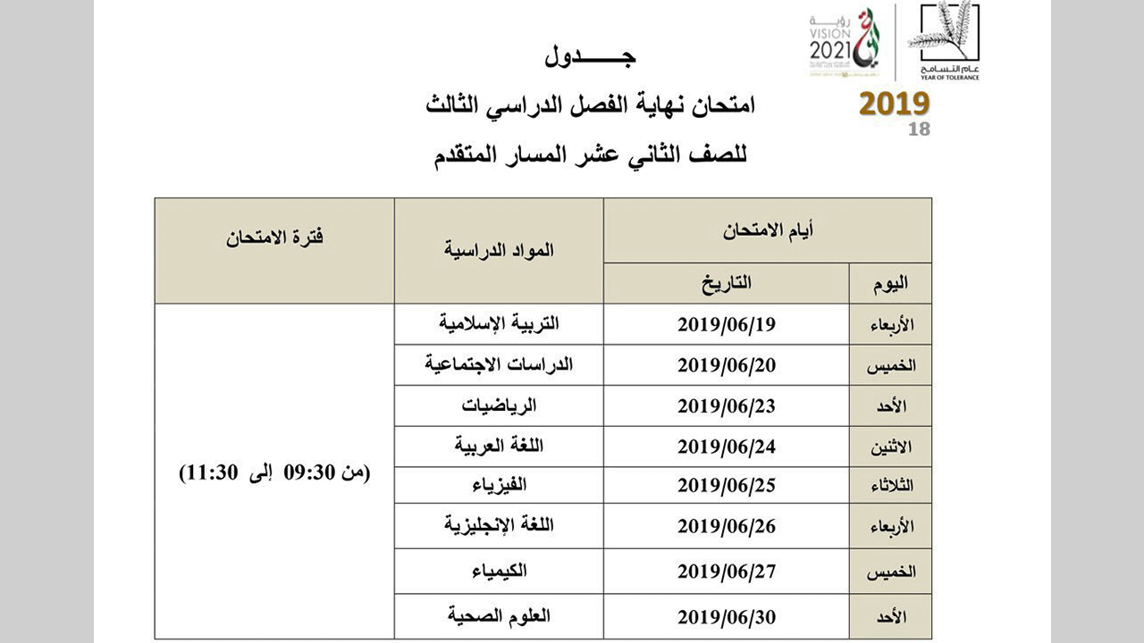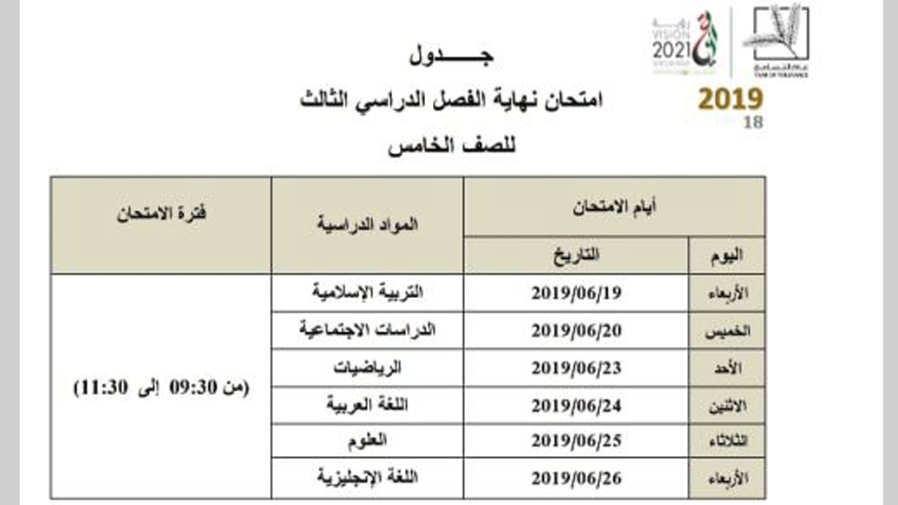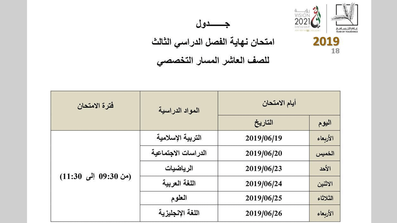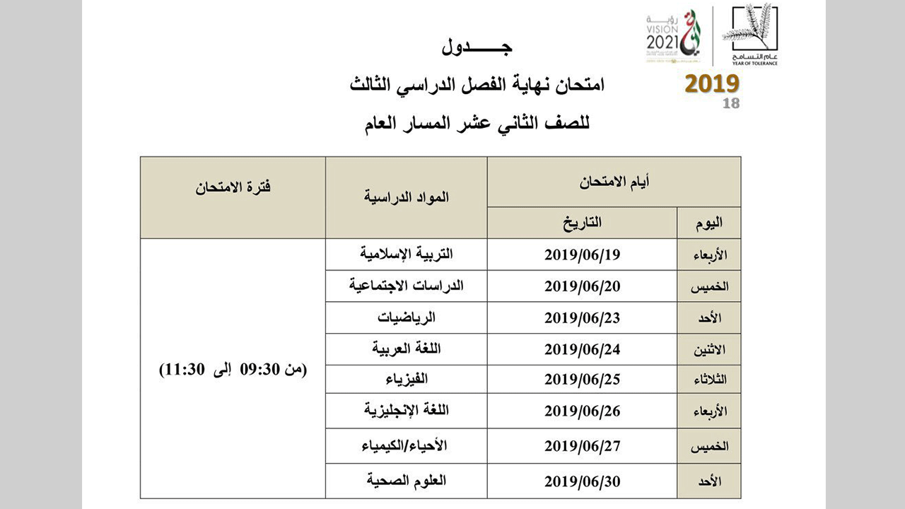أعلنت وزارة التربية والتعليم اليوم جداول امتحانات طلبة المدارس الحكومية والمدارس الخاصة التي تدرس المنهاج الوزاري، من الصف الأول إلى الصف الثاني عشر، وسوف تبدأ الامتحانات في 19 من الشهر الجاري، وتنتهي في 30 من الشهر نفسه.