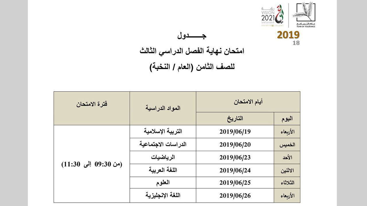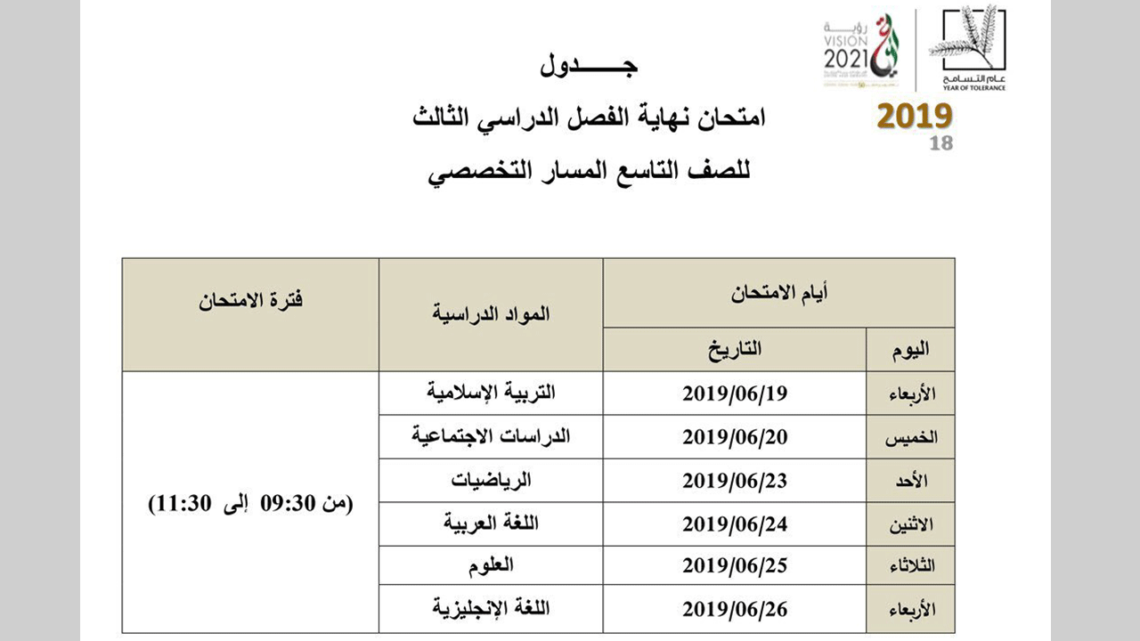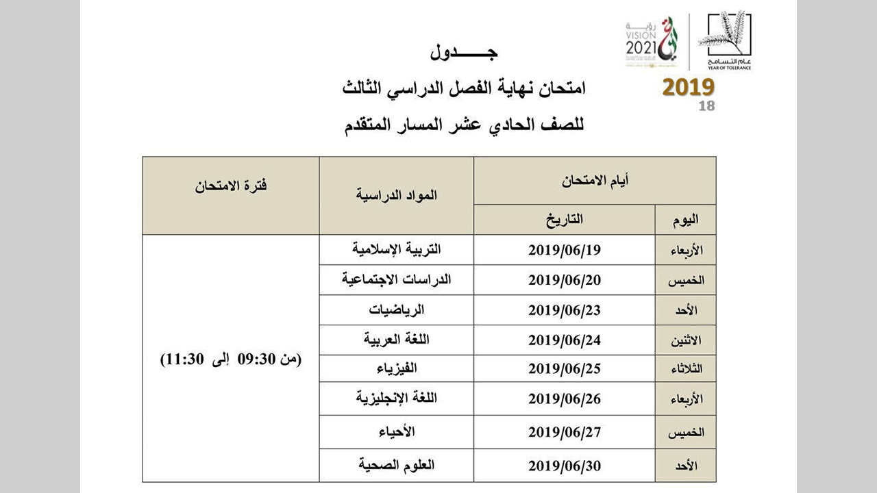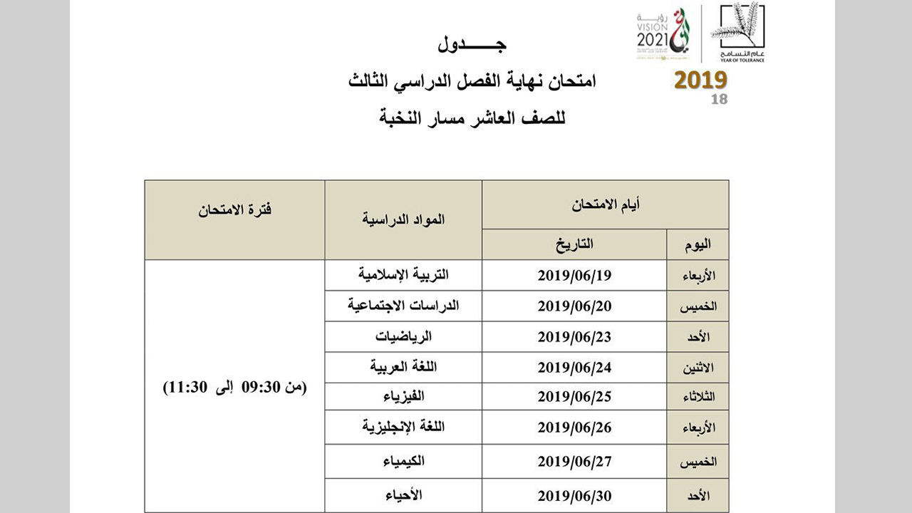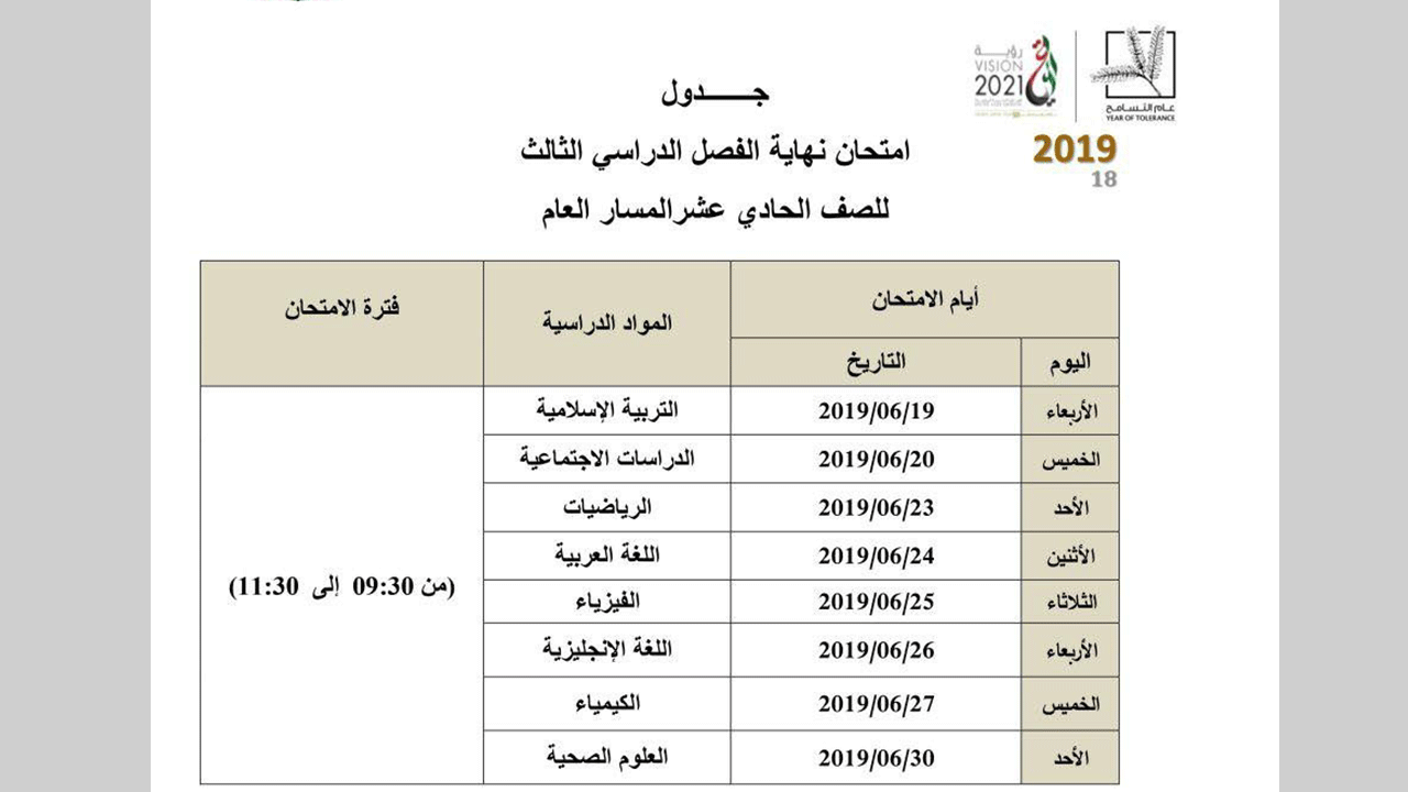 أعلنت وزارة التربية والتعليم اليوم جداول امتحانات طلبة المدارس الحكومية والمدارس الخاصة التي تدرس المنهاج الوزاري، من الصف الأول إلى الصف الثاني عشر، وسوف تبدأ الامتحانات في 19 من الشهر الجاري، وتنتهي في 30 من الشهر نفسه.