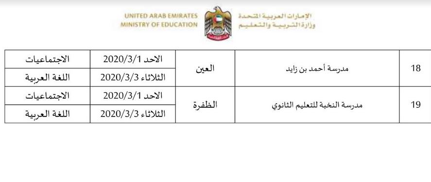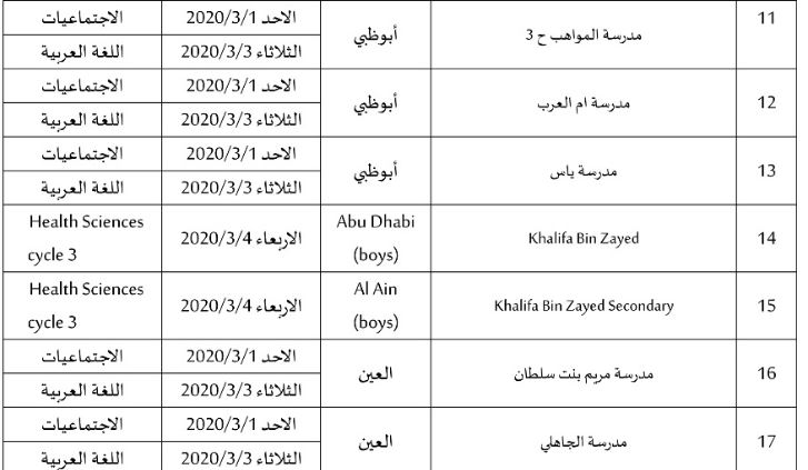 وتضم المدارس كلا من مدرسة رأس الخيمة للتعليم الثانوي، ومدرسة أم القيوين للتعليم الأساسي ح1 بنين، ومدرسة السلمة للتعليم الأساسي والثانوي، ومدرسة خولة بنت ثعلبة، ومدرسة عجمان للتعليم الثانوي، ومدرسة الثانوية النموذجية، ومدرسة المجد النموذجية، ومدرسة المواهب ح3، ومدرسة أم العرب، ومدرسة ياس، ومدرسة مريم بنت سلطان، ومدرسة الجاهلي، ومدرسة أحمد بن زايد، ومدرسة النخبة للتعليم الثانوي، وFatima AlZahra Girls School، وRAK Training Centre، وIslamic and SCIENTFIC INSTITUTE، وKhalifa bin zayedK ,Khalifa ben Zayed Secondary.