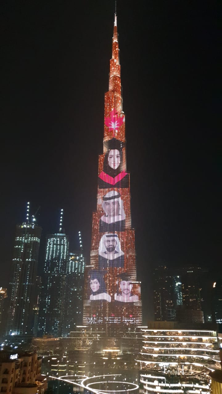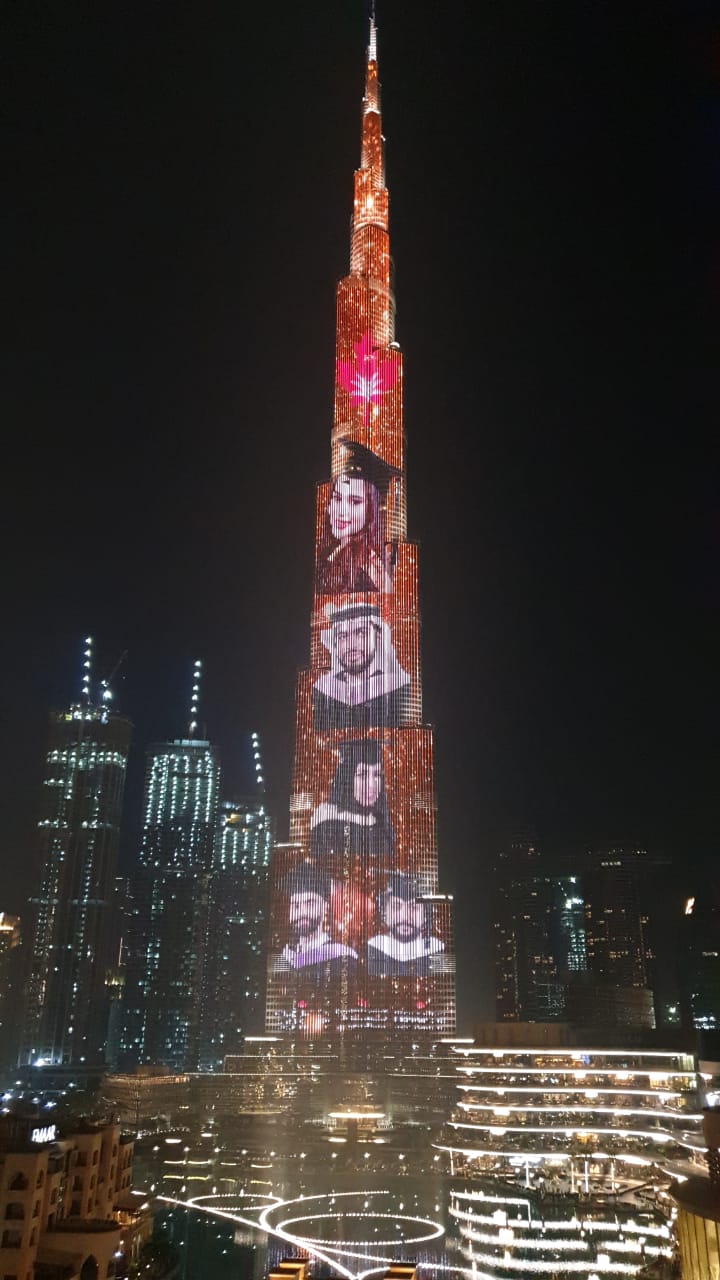 أضاء برج خليفة اليوم الجمعة، بصور خريجي طلبة الجامعة الكندية، والتي نظمت حفل تخريج دفعة من طلبتها، تحت رعاية وزير التسامح، الشيخ نهيان مبارك آل نهيان.