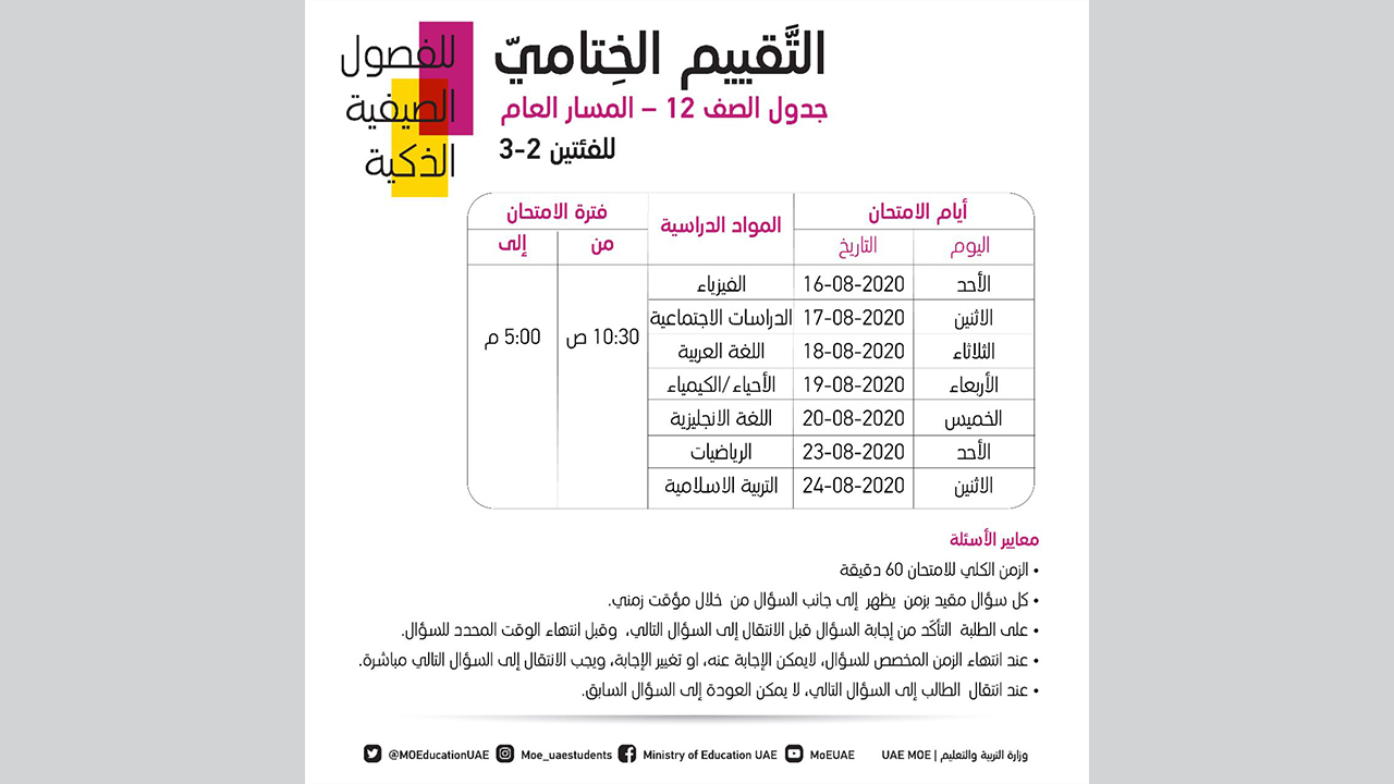 أعلنت وزارة التربية والتعليم، بدء امتحانات طلبة الصف الـ12 للتعليم العام والخاص المطبق لمنهاج الوزارة في المسارين العام والمتقدم، في 16 أغسطس والمخصصة للطلبة الذين لم يتمكنوا من اجتياز مادة أو أكثر، أو الراغبين بتحسين النسبة في مواد (اللغة العربية – اللغة الإنجليزية – الرياضيات)، وذلك في الفصول الصيفية الذكية.