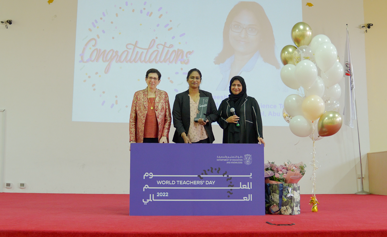 احتفلت دائرة التعليم والمعرفة في أبوظبي بيوم المعلم العالمي 2022 عبر تكريم ثلاثة معلمين متميزين في أبوظبي، تقديراً لتفانيهم في العمل ومساهماتهم القيّمة في بناء الجيل التالي من المتعلمين مدى الحياة، وشملت قائمة المعلمين الفائزين بجائزة يوم المعلم العالمي 2022، دانييل ستيفن إيميري، وسونيلا بوخاري سلمان شاودري، وغريشما راجيش أنيل كومار. وتم تكريمهم أمام طلبتهم وزملائهم خلال زيارة مفاجئة لمدراسهم.