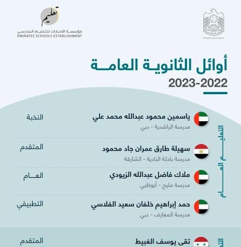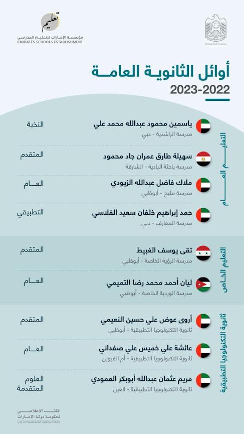 وتضمنت قائمة الأوائل على التعليم العام ياسمين محمود عبدالله محمد علي الأولى من مسار النخبة بمدرسة الراشدية بدبي، وسهيلة طارق عمران جاد محمود (مسار متقدم بمدرسة باحثة البادية- الشارقة)، وملاك فاضل عبدالله الزيودي (عام – مدرسة مليح أبو ظبي)، وحمد إبراهيم خلفان سعيد الفلاسي (تطبيقي مدرسة المعارف- دبي)
