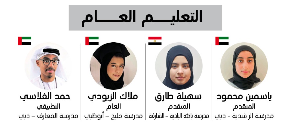 أما بالنسبة للتعليم الخاص، فجاءت تقى يوسف الغبيط (متقدم- مدرسة الرؤية الخاصة أبوظبي)، وليان أحمد محمد رضا التميمي (عام- مدرسة الوردية الخاصة- أبوظبي).
