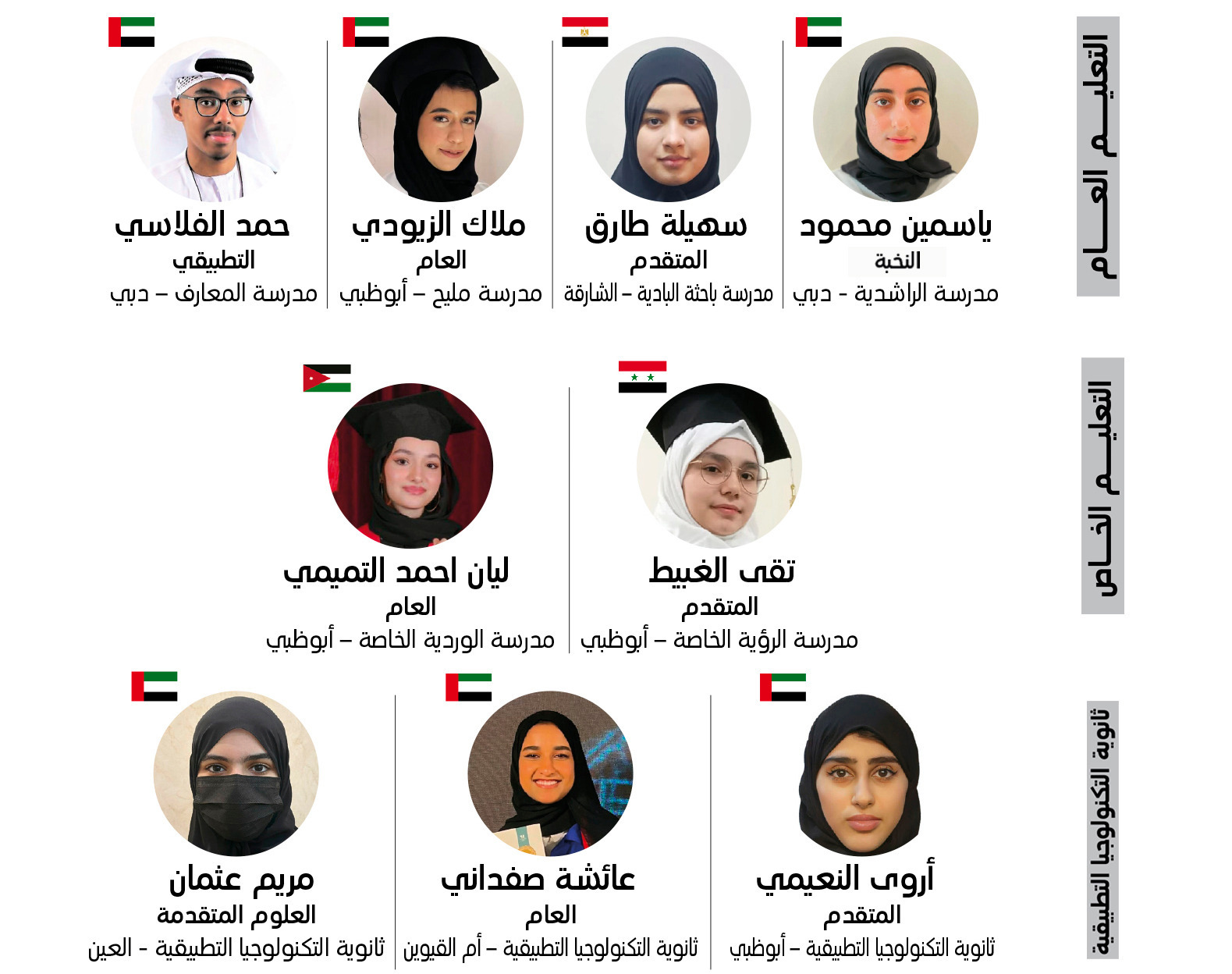 وتضمنت قائمة الأوائل على التعليم العام ياسمين محمود عبدالله محمد علي الأولى من مسار النخبة بمدرسة الراشدية بدبي، وسهيلة طارق عمران جاد محمود (مسار متقدم بمدرسة باحثة البادية- الشارقة)، وملاك فاضل عبدالله الزيودي (عام – مدرسة مليح أبو ظبي)، وحمد إبراهيم خلفان سعيد الفلاسي (تطبيقي مدرسة المعارف- دبي)