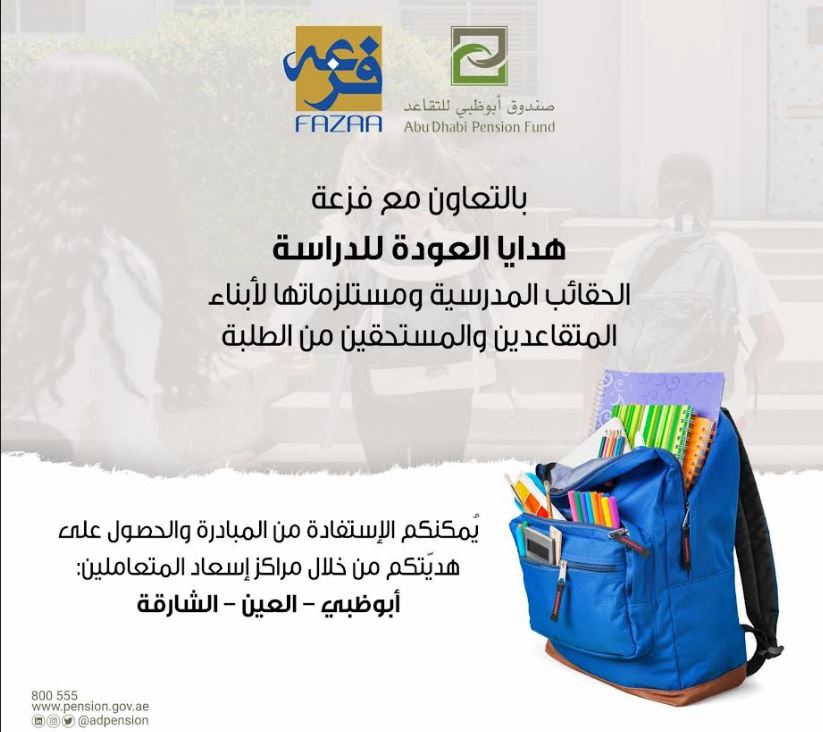 أطلق صندوق أبوظبي للتقاعد بالتعاون مع صندوق التكافل الاجتماعي للعاملين في وزارة الدخلية (فزعة) مبادرة مجتمعية جديدة بمناسبة موسم العودة للدراسة، تتضمّن توزيع هدايا للطلبة من أبناء المتقاعدين والمستحقين وأسرهم المسجلين لدى الصندوق، عبارة عن حقيبة مدرسية بكامل مستلزماتها من القرطاسية.