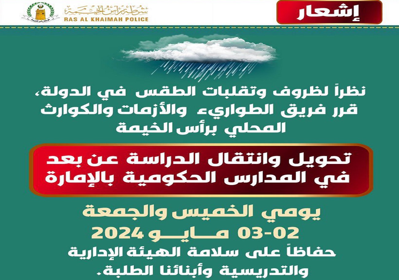 نظراً لظروف وتقلبات الطقس في الدولة، قرر فريق الطوارئ والأزمات والكوارث المحلي برأس الخيمة "تحويل وانتقال الدراسة عن بعد في المدارس الحكومية بالإمارة يومي الخميس والجمعة 2024 02-03 مايو حفاظاً على سلامة الهيئة الإدارية والتدريسية وأبنائنا الطلبة".