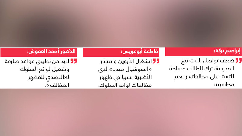 ولفت إلى أن العوامل تتضمن أيضاً، ضعف تواصل البيت مع المدرسة، ما ترك للطالب مساحة للتستر على مخالفاته وعدم محاسبته، وانشغال الطلبة في أمور جديدة تبعدهم عن اكتساب العادات السليمة، والتأثر بما يشاهدونه على مواقع التواصل الاجتماعي من تصرفات منافية للذوق العام.