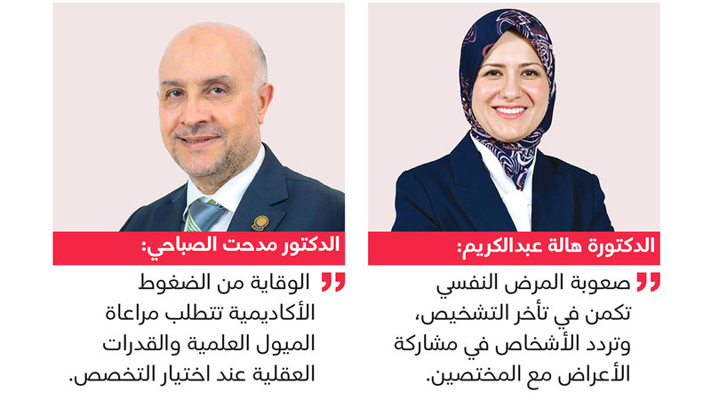 وقال: «الوقاية من الضغوط الأكاديمية تتطلب مراعاة الميول العلمية والقدرات العقلية عند اختيار المواد الدراسية والتخصص الأكاديمي، وتنظيم وإدارة الوقت لإتمام المهام والمتطلبات، حتى لا تتراكم الأمور ويحدث ضغط نفسي، ومزاولة الرياضة والحفاظ على نظام غذائي صحي بشكل منتظم، والتدريب على الدراسة بنظام محدد حتى لا يقع الطالب تحت ضغط نفسي، وفي حال وجود أي مشكلة في التركيز والانتباه، يجب مراجعة الطبيب النفسي لتحديد ما إذا كان الشخص يعاني اضطراب فرط الحركة، أو تشتت الانتباه، حتى لا يكون الأمر عبئاً عليه في الدراسة»، لافتاً إلى أن عيادات الطب النفسي باتت تستقبل مراجعين من فئة الطلبة، لمناقشة وعلاج أعراض القلق والاكتئاب وغيرها من الأعراض التي تصيب بعض الطلبة.