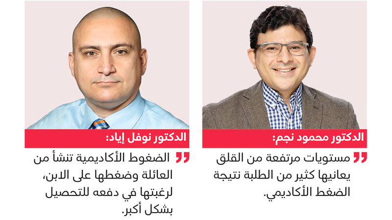 وقال الدكتور محمود نجم، استشاري الطب النفسي في مدينة برجيل الطبية: «الضغوط الأكاديمية هي جزء لا يتجزأ من المسيرة التعليمية، لكن تزايد تأثيراتها النفسية، ووصولها إلى درجات سلبية، يجب أن يتم رصدها في حينها ومواجهتها، فالدراسات تشير إلى أن العديد من الطلبة يعانون مستويات مرتفعة من القلق والاكتئاب نتيجة الضغط الأكاديمي، حيث يتسبب التنافس الشديد، والرغبة في تحقيق التميز، في شعور الطلاب بالتوتر المستمر».