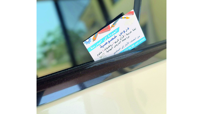 رصدت «الإمارات اليوم» عشرات البطاقات الورقية التي تحتوي على عبارات ترويجية من نوع «حقق التفوق الآن.. دروس خصوصية لجميع المواد»، تحمل أرقام هواتف فقط، من دون أسماء أو جهات رسمية.