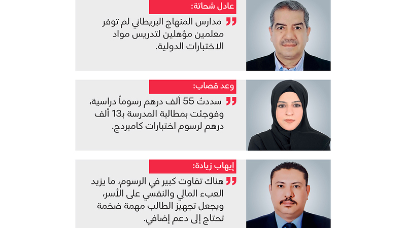 وأفادوا بأن هناك تفاوتاً في الرسوم الدراسية في مدارس المناهج الأجنبية وفقاً للتقييمات السنوية التي تخضع لها كل مدرسة، مشيرين إلى أن التدريب «غير كافٍ»، ولا يُعِدّ أبناءهم لاجتياز تلك الاختبارات، التي تُعدّ شرطاً أساسياً للاعتراف بالشهادة والقبول الجامعي، موضحين أن ضعف الإعداد دفع أبناءهم إلى «تعليم موازٍ»، يشمل دروساً خصوصية تصل فيها كُلفة الساعة إلى 400 درهم.