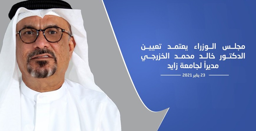 اعتمد مجلس الوزراء برئاسة صاحب السمو الشيخ محمد بن راشد آل مكتوم، نائب رئيس الدولة رئيس مجلس الوزراء حاكم دبي، قراراً بتعيين الدكتور خالد محمد الخزرجي مديراً لجامعة زايد.