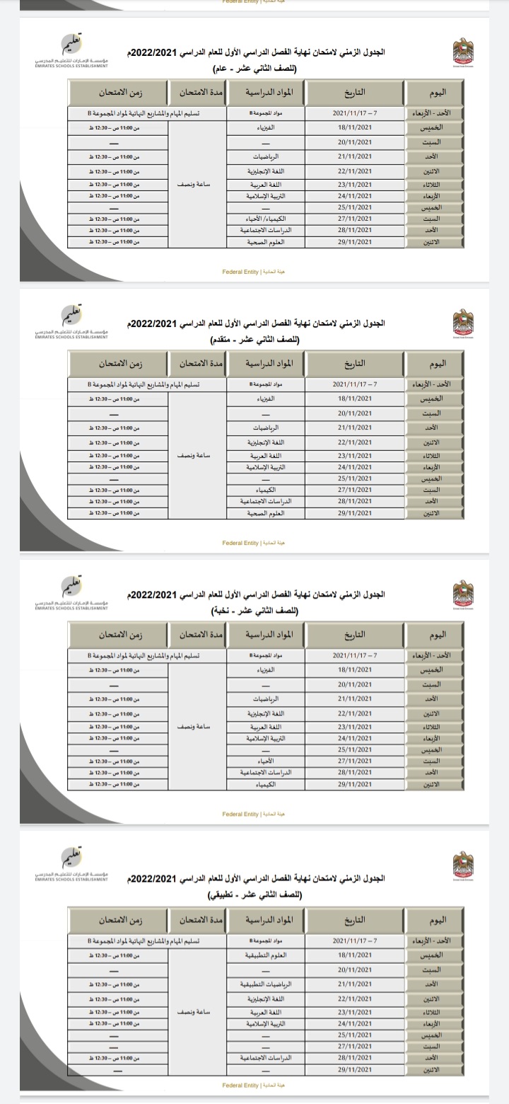 اعتمدت مؤسسة الإمارات للتعليم المدرسي، جداول امتحانات نهاية الفصل الدراسي الأول للعام الدراسي الجاري، التي تنعقد خلال الفترة من 18نوفمبر الجاري إلى 29 من الشهر نفسه، لطلبة الصفوف من الرابع إلى الثاني عشر في المدارس الحكومية والخاصة التي تطبق المنهاج الوزاري.