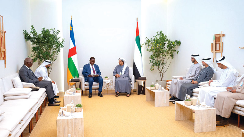 منصور بن زايد ورئيس إفريقيا الوسطى خلال اللقاء. وام
