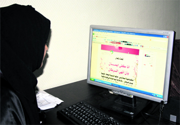 سلوى إبراهيم تتصفّح المنتدى الإلكتروني الذي أسسته لمساعدة المصابات بسرطان الثدي. الإمارات اليوم