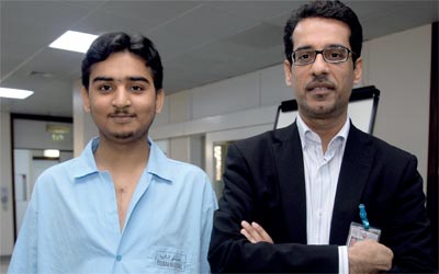 الدكتور عبيد الجاسم (يمين) والمريض محمد قبل خروجه من المستشفى أمس. تصوير: باتريك كاستيلو