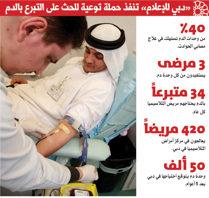 وذكرت أن المركز بحاجة إلى «متبرعين دائمين بالدم» يؤمّنون احتياجات المرضى، موضحة أن دراسة أجريت أخيراً في هيئة الصحة بدبي، أظهرت أن «مريض الثلاسيميا يحتاج إلى 34 متبرعاً بالدم كل عام».