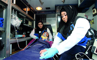 مسعفو دبي مؤهلون لتطبيق معايير العناية المركّزة في موقع الحادث. الإمارات اليوم