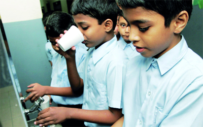 طلاب يشربون المياه من خزانات مدرسية. تصوير: تشاندرا بالان