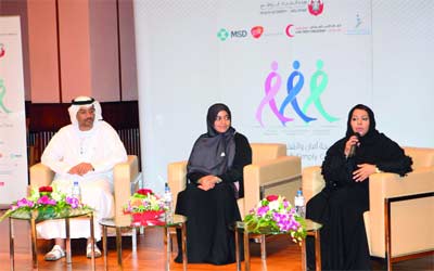 وأوضحت أن نصف الحالات المصابة من مختلف أنواع السرطانات من السيدات، وأن الإصابة بمرض سرطان الثدي تحتل المرتبة الأولى عند السيدات بعد سرطان عنق الرحم، لافتة إلى أن عدد الحالات المصابة بسرطان الثدي وصلت الى 190 حالة العام الماضي، وسرطان القولون الى 65 حالة، وسرطان عنق الرحم الى 55 حالة، لافتة إلى وجود حالتين الى ثلاث حالات لسرطان الثدي عند الرجال سنوياً، وان أصغر حالة إصابة بسرطان الثدي لفتاه عمرها 16 عاماً. وقالت انه يوجد في الدولة 18 مركزا للفحص المبكر، وأربع وحدات متنقلة للفحص بالميموغرام، مضيفة انه تم تطبيق نظام إلكتروني مع مستشفيات «صحة» ومستشفيات القطاع الخاص للتبليغ عن الحالات المصابة بالسرطان، لافتة إلى توزيع تعاميم إجبارية على مزودي الخدمات الصحية للالتزام بهذا الأمر، وذكرت أن مشروع الوقاية من مرض السرطان نتاج تضافر جهود منظمات حكومية وغير الحكومية.