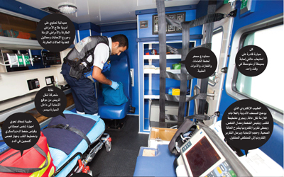 وأضاف: «لا تكتفي المؤسسة بتقديم خدمات الاسعاف التقليدية، بنقل المرضى إلى المستشفيات، بل إن مركبات الاسعاف في دبي مجهزة لتكون عيادات طبية، وغرف عناية مركزة متنقلة، ما يضمن تقديم أفضل رعاية طبية للمريض إلى حين وصوله للمستشفى، موضحاً أن كل سيارة مزودة بأجهزة للانعاش القلبي وتخطيط القلب وقياس الضغط والسكري، وطبيب إلكتروني يرسل تقاريره الى المستشفيات المستقبلة».