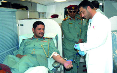 تَقدَّم مدير مديرية شرطة العين، العميد حمد عجلان العميمي، حملة تبرع بالدم نظمتها المديرية بالتعاون مع بنك الدم الإقليمي في مستشفى توام، بالاشتراك مع «جونز هوبكنز» الطبية، في مبادرة تهدف إلى تشجيع جميع منتسبي المديرية من ضباط وأفراد للتبرع بدمائهم، بما يسهم في توفير كميات من فصائل الدم للمحتاجين والمرضى، خصوصاً مرضى الثلاسيميا ومصابي الحوادث المرورية. وشارك في الحملة نائب مدير المديرية، العقيد محمد سهيل الراشدي، وعدد من الضباط، وأكد العميد العميمي أهمية المبادرة الإنسانية والحضارية بالتبرع بالدم، تجسيداً لرؤية واستراتيجية القيادة العامة لشرطة أبوظبي في خدمة المجتمع.