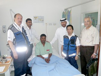 فريق من مؤسسة دبي للإسعاف أثناء زيارتهم للمريض في المستشفى للاطمئنان عليه - وام
