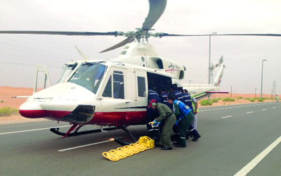 وذكرت إدارة جناح الجو، أن طائرة الإسعاف الجوي التابعة لها تحرّكت من نقطة تمركزها في فندق قصر السراب بمجرّد تلقي بلاغ من غرفة العمليات، وعند تحديد إحداثيات المكان وهبوط الطائرة، قدم طاقمها الإسعافات الأولية للمصابيْن، ونقلهما إلى مستشفى مدينة زايد في المنطقة الغربية، استكمالاً لتلقي العلاج اللازم.