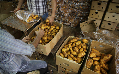عملية فرز وتعبئة البطاطا في سوق العوير للخضار والفواكه. تصوير: عبدالله حسن