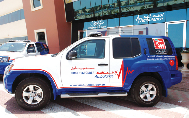 تسلم السيارتين المدير التنفيذي لمؤسسة دبي لخدمات الإسعاف خليفة الدراي، خلال الزيارة التي قام بها وفد من شركة الطاير ضم الدكتور طارق حميد الطاير والمهندس حميد أحمد الطاير لمقر المؤسسة.