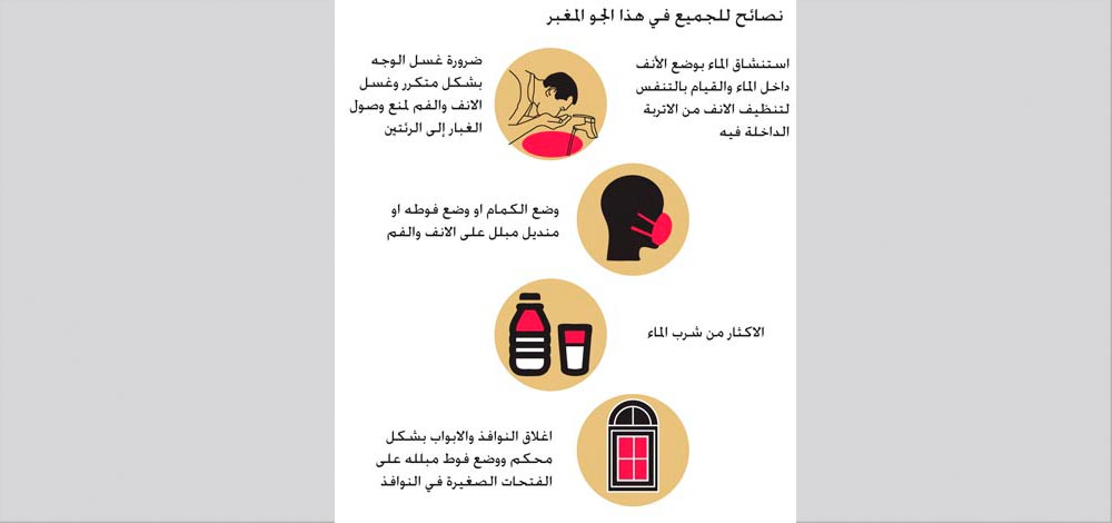 وأكد أستاذ أمراض الجهاز التنفسي، الدكتور صلاح فاروق، أن مخاطر العواصف الرملية تتمثل في تلوث الهواء بشكل كبير، ما يؤثر في الجهاز التنفسي، خصوصاً لدى من يعاني مرض الربو والأمراض الصدرية، كما تعمل ذرات الغبار على تهييج الجهاز التنفسي، ما يتسبب في حساسية الأنف.