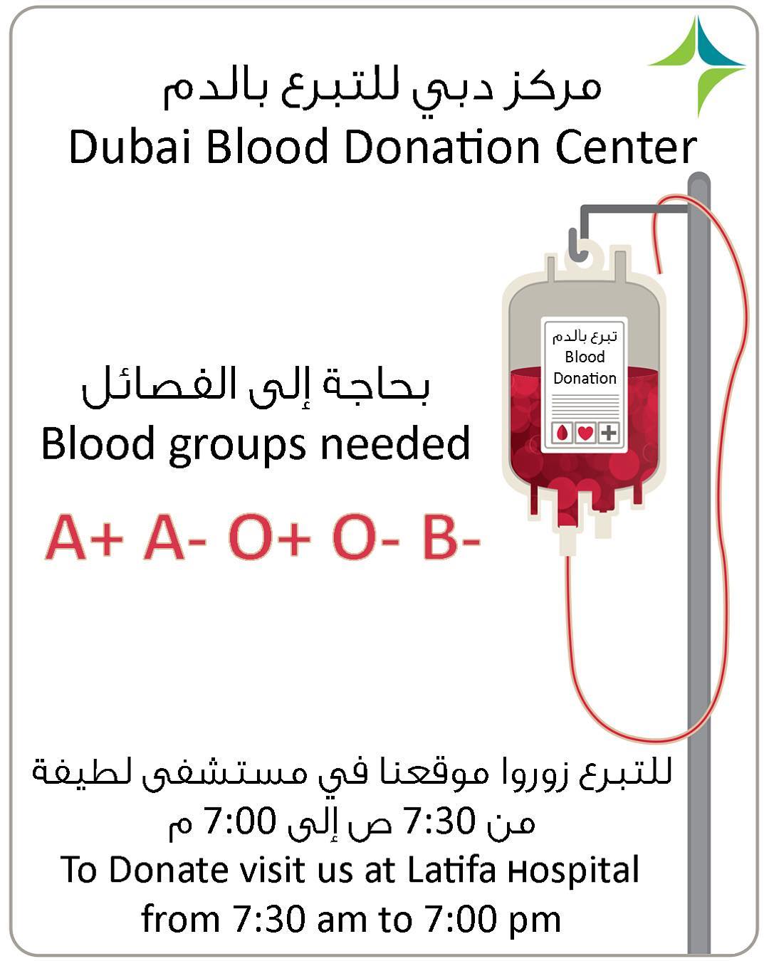 اعلنت هيئة الصحة بدبي عن حاجة مركز دبي للتبرع بالدم، لمتبرعين من فصائل الدم التالية :-A+ ، A-، B- ، O+ ، O .