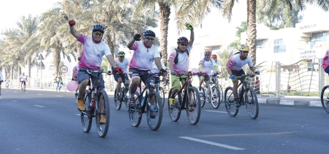 نظمت تعاونية الاتحاد وهيئة الصحة في دبي، أمس، مسيرة بالدرّاجات الهوائية والنارية، للعام الرابع على التوالي تحت شعار «طواف دبي الوردي»، بهدف نشر الوعي بمرض سرطان الثدي وتضامناً مع المرضى، بمشاركة أكثر من 1200 درّاجة، 1000 هوائية و200 نارية، وذلك بالتعاون مع شرطة دبي ومجلس دبي الرياضي واتحاد الإمارات لرياضة السيارات والدرّاجات النارية، والبرنامج الوطني التطوعي للاستجابة في حالات الطوارئ، وهيئة الطرق والمواصلات.