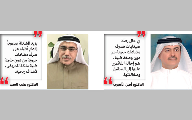 من جانبه، قال وكيل الوزارة المساعد لسياسة الصحة العامة والتراخيص، الدكتور أمين الأميري، إن «الوزارة أصدرت، أخيراً، تعميماً للمستشفيات والمراكز الصحية، على مستوى الدولة، بضرورة ترشيد وصف وصرف المضادات الحيوية، وطالبت بعدم تناولها دون استشارة الطبيب المختص، وعدم صرفها من الصيدلية إلا بموجب وصفة طبية، والحرص على التزام الأطباء بالبروتوكولات العلاجية عند وصفها للمرضى».