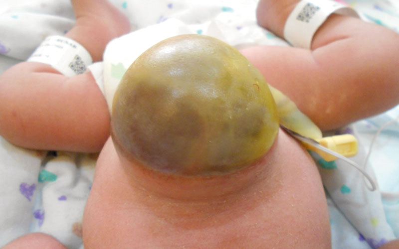 | أجزاء من المعدة والأمعاء والكبد خرجت من البطن على شكل كرة مغلفة بغشاء من الحبل السري. |