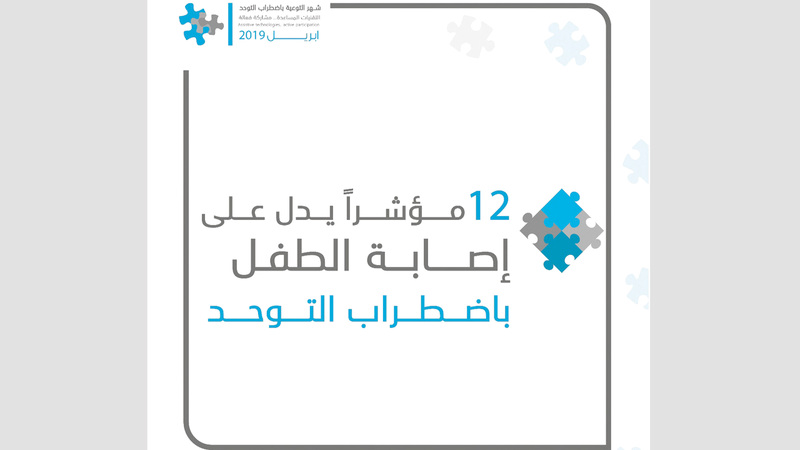 أعدت وزارة تنمية المجتمع لافتات توضيحية توعي أفراد المجتمع بمؤشرات تدلّ على إصابة الطفل باضطراب التوحد، بثتها في رسالة صحافية، ضمن جهودها المبذولة للتعريف بالاضطراب، إذ شهدت بداية الشهر الجاري تاريخ الاحتفاء باليوم العالمي للتوعية به. وتتضمن المؤشرات 12 دلالة تنبه إلى ضرورة مراقبة الطفل، وعرضه على الأخصائيين، للتأكد مما إذا كان لديه «توحد»، وذلك لاتخاذ الإجراءات الصحيحة في أسرع وقت ممكن.