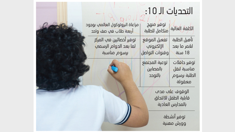 وتصدرت التحديات الكلفة العالية التي يتكبدها ذوو الطفل المصاب بالتوحد، إذ تبلغ 60 ألف درهم سنوياً في المركز، مشيرين إلى حاجتهم للدعم الحكومي لتأمين هذا المبلغ، إضافة إلى توفير منهج متكامل للطلبة، ومراعاة البروتوكول العالمي بوجود أربعة طلاب في صف واحد، للحصول على أحسن النتائج، وتأهيل وتمكين الطلبة لعمر ما بعد 18 سنة، عن طريق توفير أنشطة وورش مهنية، وتفعيل الموقع الإلكتروني وقنوات التواصل بما يناسب مستوى المركز، وتوفير حافلات مناسبة لنقل الطلبة برسوم معقولة، خصوصاً أن بعضهم موظفون ويواجهون صعوبة في نقل أطفالهم بأنفسهم، وتوفير أخصائيين في المركز لما بعد الدوام الرسمي برسوم معقولة، حرصاً على تنمية الطفل وتطويره، وتعليم أطفال التوحد مهناً تتناسب مع قدراتهم وتسهم في تطويرها، وتوعية المجتمع بالمصابين بالتوحد، والوقوف على مدى قابلية الطفل للالتحاق بالمدارس العادية، وقدرته على الانتقال إلى هذه المرحلة.