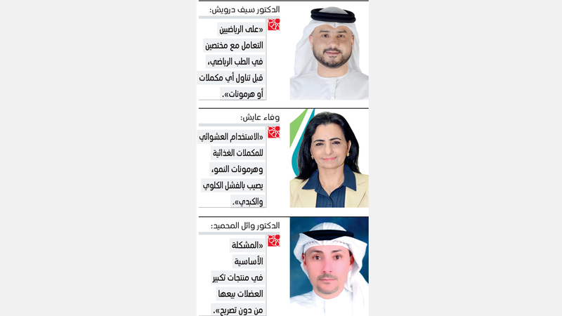 وحذرت مديرة إدارة التغذية السريرية في قطاع الخدمات الطبية المساندة في هيئة الصحة بدبي، وفاء عايش، من الاستخدام العشوائي للمكملات الغذائية وهرمونات النمو، خصوصاً لممارسي رياضة كمال الأجسام، بهدف بناء العضلات، كونها قد تكون سبباً مباشراً للإصابة بالفشل الكلوي والكبدي، وضمور الخصيتين، والضعف الجنسي، والعقم، والموت المفاجئ.