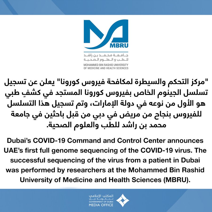 أعلن "مركز التحكم والسيطرة لمكافحة فيروس كورونا" عن تسجيل تسلسل الجينوم الخاص بفيروس كورونا المستجد، في كشفٍ طبي هو الأول من نوعه في دولة الإمارات، وتم تسجيل هذا التسلسل للفيروس بنجاح من مريض في دبي من قبل باحثين في جامعة محمد بن راشد للطب والعلوم الصحية.