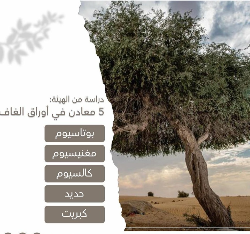 كشفت دراسة أجرتها هيئة حماية البيئة والتنمية في رأس الخيمة، أحيراً، عن ارتفاع معدلات المعادن الرئيسة في أوراق شجرة الغاف، بأضعاف ما تحتويه الأشجار والخضراوات المعروفة بغناها بهذه المعادن.