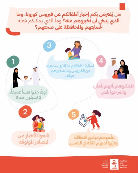 وحددت الهيئة 5 خطوات يجب اتباعها عند إبلاغ الأطفال أو التحدث معهم بشأن جائحة كورونا، تشمل بالترتيب «أخذ نفس عميق، التأكد من صدق كل معلومة سيتم نقلها للطفل عبر المصادر الموثوقة، سؤال الطفل عمّا إذا سمع شيئاً عن هذا الفيروس وما الذي فهمه وبم يشعر حيال الأمر، بذل كل جهد لطمأنة الطفل وشرح الأمر له بشكل يسير ومبسط، الانتهاء معهم إلى أهمية النظافة وتعليمهم مبادئها كحائط صد للحماية من الفيروس».