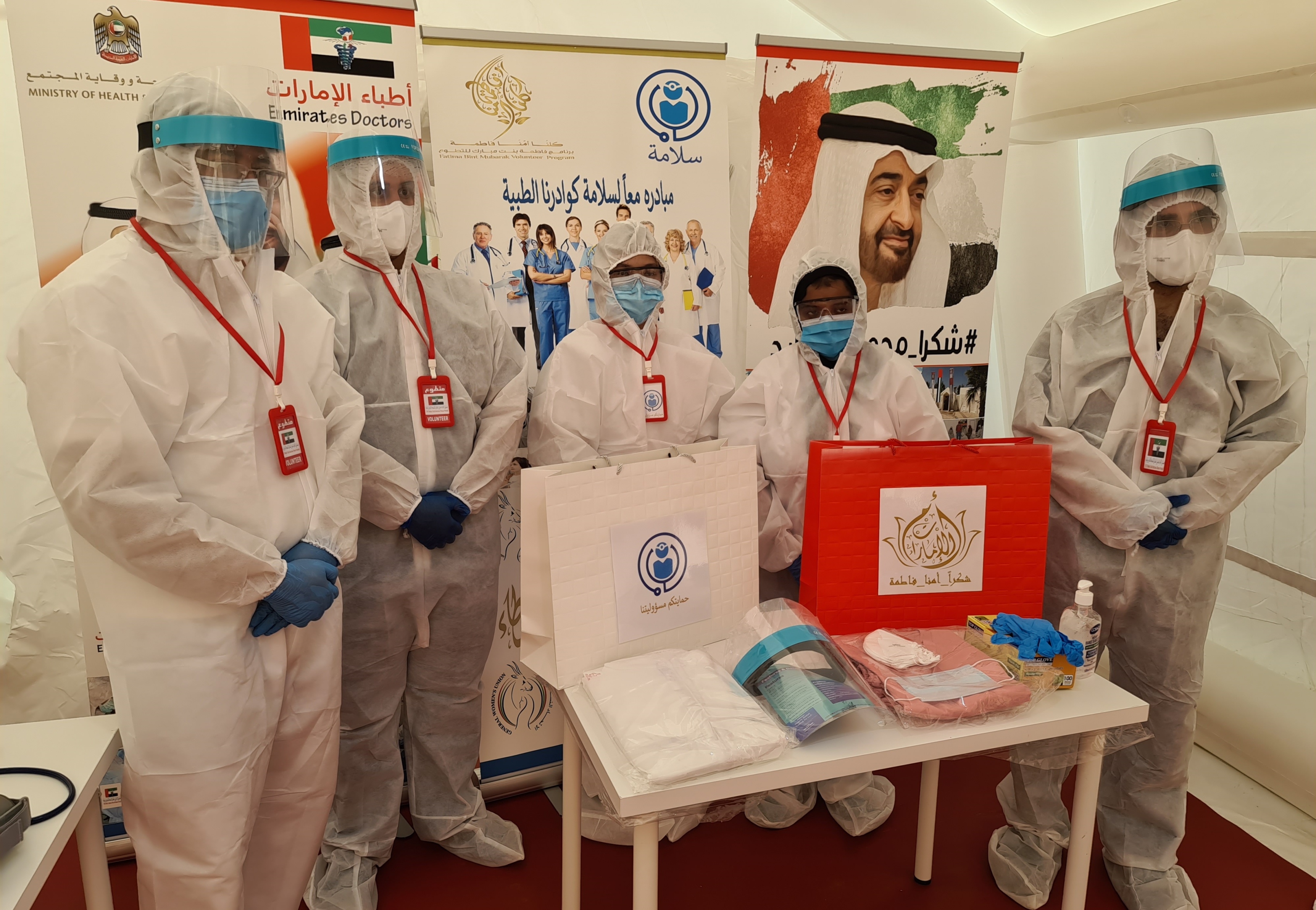 اطلقت مبادرة زايد للعطاء والاتحاد النسائي العام وبرنامج الشيخة فاطمة للتطوع، «مبادرة حمايتهم مسؤوليتنا» لتقديم مستلزمات الوقاية لحماية الكوادر الطبية من اطباء وممرضين ومسعفين من خطر فيروس كورونا (كوفيد 19) من خلال توفير ملابس طبية خاصة صنعت بايادي اماراتية من المتطوعين في برنامج الشيخة فاطمة للتطوع لتمثل رسالة شكر وعرفان لخط دفاعنا الاول تقديراً لجهودهم في مواجهة جائحة فيروس كورونا.