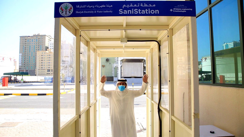 «كهرباء الشارقة» تستخدم ممرات آلية لتعقيم الموظفين والمتعاملين. من المصدر