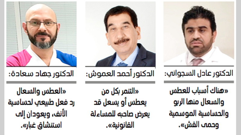وأفاد أخصائي علم الأمراض المعدية والمناعة، مدير مختبر العناية الطبي، الدكتور جهاد سعادة، بأن العطس والسعال رد فعل طبيعي لحساسية الأنف، ويكونان بسبب شم غبار أو تغيير بيئي من مكان بارد إلى حار خصوصاً عند المرور بجوار المبردات في مراكز التسوّق، مطالباً بعدم التنمر بمن يعطس أو يسعل أو النظر إليه بشكل سلبي.