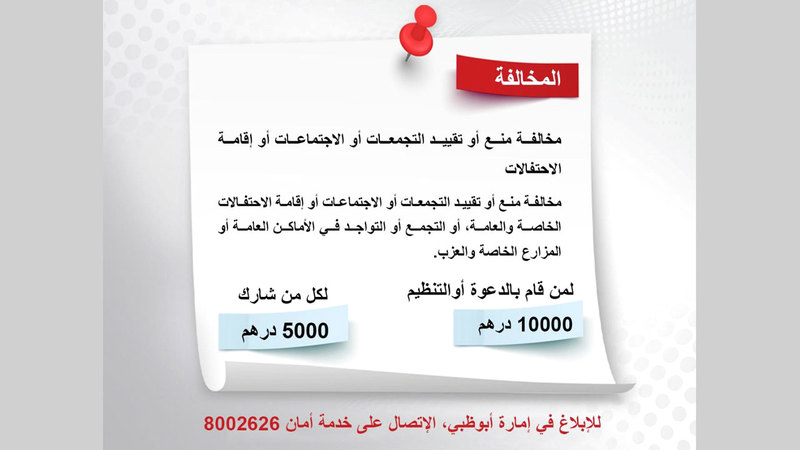 وناشدت الجمهور التعاون في الإبلاغ عن أية تجمعات أو مخالفات للتعليمات الصادرة عن الجهات الرسمية وسرعة التواصل مع (خدمة أمان) على الرقم المجاني 8002626، أو الرسائل النصية 2828 أو البريد الإلكتروني Aman@adpolice.gov.ae، حفاظاً على سلامة جميع أفراد المجتمع.