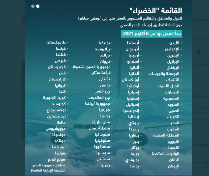كشفت دائرة الثقافة والسياحة - أبوظبي عن «القائمة الخضراء» المحدثة للمسافرين القادمين إلى أبوظبي، حيث سيعفى المسافرون القادمون من هذه الدول من فترة العزل الإجبارية عند زيارتهم إلى أبوظبي وسيطلب منهم فقط إجراء اختبار بي سي آر عند الوصول إلى مطار أبوظبي الدولي. على أن يبدأ العمل بها اعتباراً من 8 أكتوبر 2021.