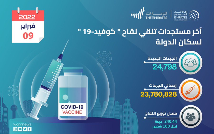 أعلنت وزارة الصحة ووقاية المجتمع عن تقديم 24,798 جرعة من لقاح "كوفيد-19" خلال الساعات الـ 24 الماضية وبذلك يبلغ مجموع الجرعات التي تم تقديمها حتى اليوم 23,780,828 جرعة ومعدل توزيع اللقاح 240.44 جرعة لكل 100 شخص.