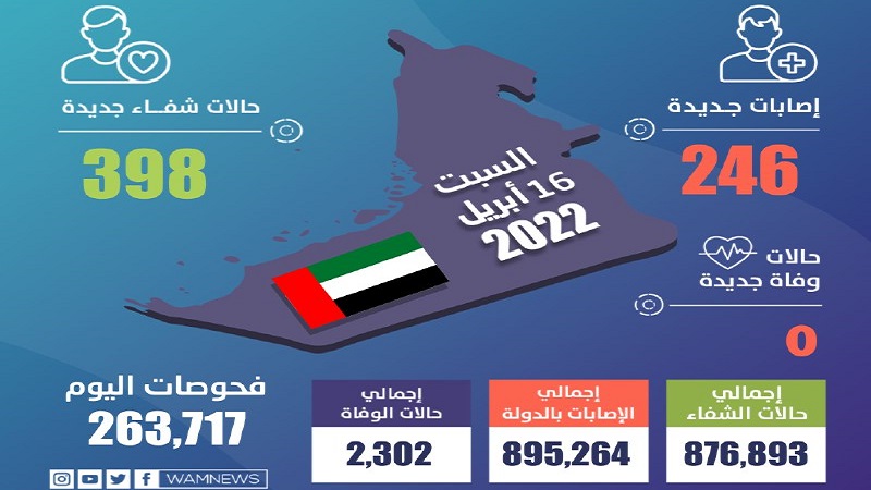 وساهم تكثيف إجراءات التقصي والفحص في الدولة وتوسيع نطاق الفحوصات على مستوى الدولة في الكشف عن 246 حالة إصابة جديدة بفيروس كورونا المستجد من جنسيات مختلفة، وجميعها حالات مستقرة وتخضع للرعاية الصحية اللازمة، وبذلك يبلغ مجموع الحالات المسجلة 895,264 حالة.